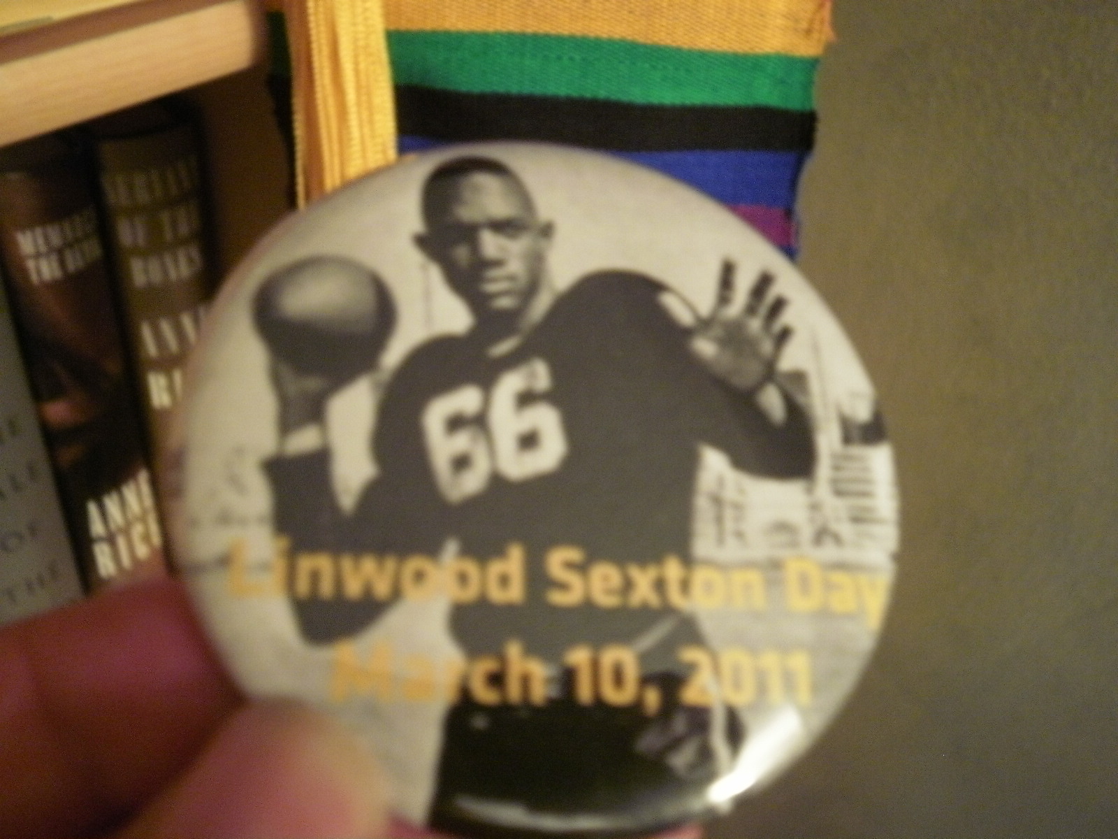 This is the button I received last Thursday at the WSU Alumni Breakfast Series featuring Linwood Sexton. For those of you unfamiliar with this gentle man, he is a 1948 graduate of the University of Wichita, a standout Shocker football player who holds WSU’s career rushing record, was named All-Missouri Valley Conference First Team three times, was a charter inductee into the Shocker Sports Hall of Fame, an honoree of the Kansas Sports Hall of Fame, and a new inductee into the MVC Hall of Fame. He earned a bachelor’s degree in education, taught school at Wichita’s L’Ouverture Elementary, became a sales manager for Hiland Dairy, and is a lauded community leader who has worked tirelessly for equal opportunity and social justice. And that is just a hint of the man.