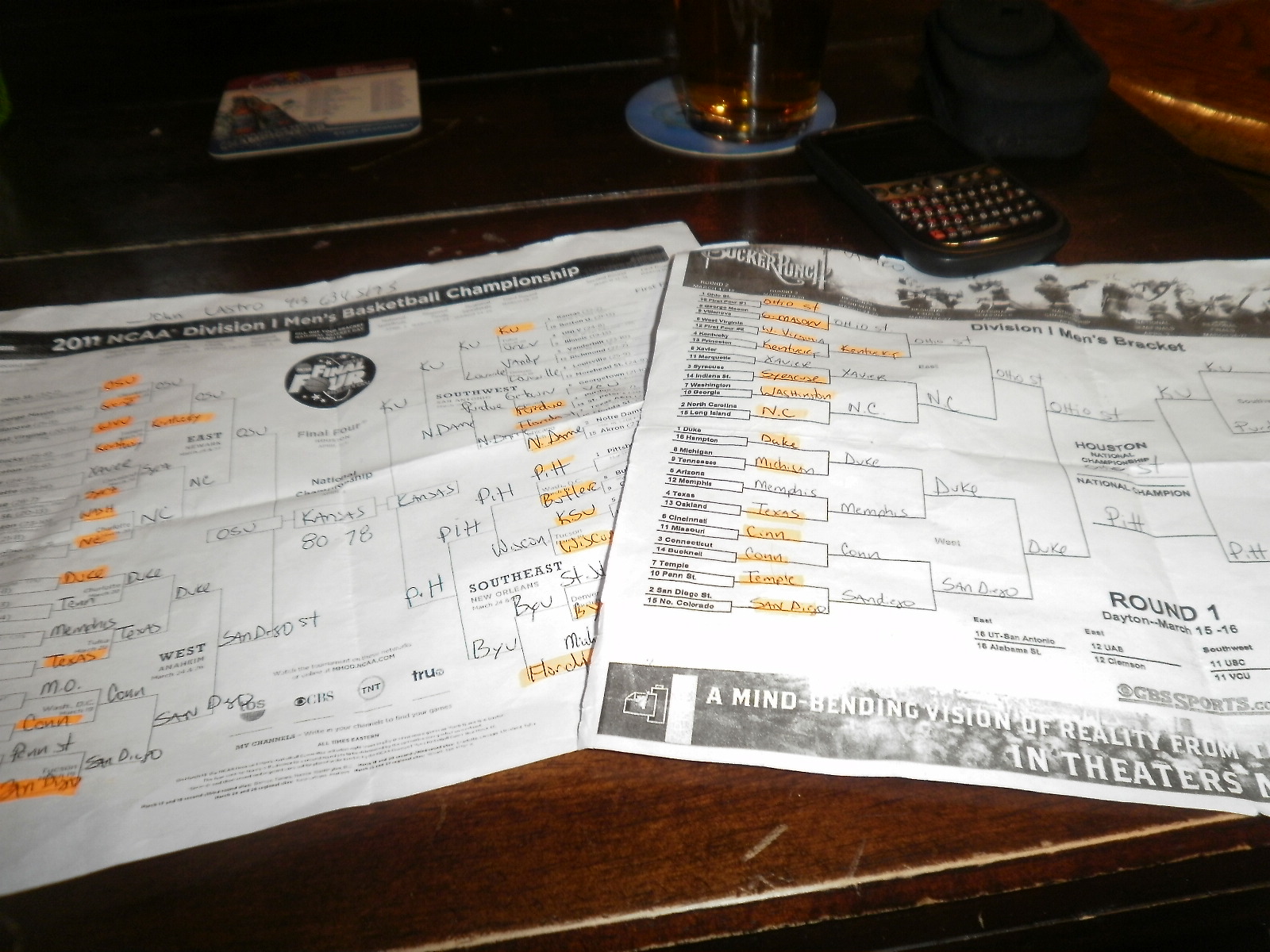 These are my two 2011 brackets. One with UConn going all the way and the other with my sentimental favorite, San Diego State. Note I picked two teams who the Shockers played, two games in which I paid serious attention to the opponent. I figured it was Steve Fisher’s time to win with his own recruits and have always cheered the Aztecs, so picking SDSU made sense to me. As for UConn, I witnessed the talent that is Kemba Walker, plus I watched Lamb and Napier bloom. Anyone who watched them win the Big East tournament in five games knew they could continue the run. And they did. While the championship game was a definite struggle to watch and enjoy, our annual Bracket Weekend in Overland Park, Kans., with my family did not disappoint.