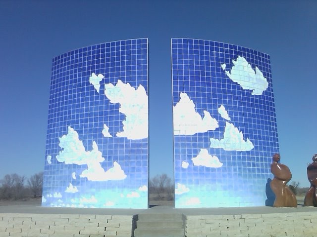 Time to head to town. Mike Wood, the executive director of the Media Resources Center at WSU, has loaned me a book, 8 Wonders of Kansas! Guidebook, written by Marci Penner and the Kansas Sampler Foundation. I told him of our Kansas resolution so he brought me the 272-page guide with its “216 Great Places to Explore in Kansas.” I want to see the Blue Sky Sculpture located at Centennial Park. Dedicated in 2001, it is the joint effort of Phil Epp, painter and designer; Terry Corbett, ceramist and designer; and Conrad Snider, ceramist and designer. It is one of the Top 8 Wonders of Kansas.
