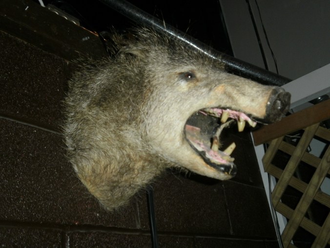 The only ones in the bar, we struck up a conversation with our bartender who was formerly from Wichita and the owner. She and her husband bought the bar five years ago, and while she enjoys running the place, she says she is still adjusting to Newton life. The bar was clean, with a decent selection of beers, plus a small menu of traditional bar food. A few regulars began to arrive, some sitting at the bar, two playing pool and slipping money into the satellite jukebox. We finished our beers, draining the last cold drops listening to Black Sabbath and David Allen Coe. I snapped a photo of the odd animal mascot on the wall, which even the owner was unsure if it was a wild boar, maybe a werewolf…