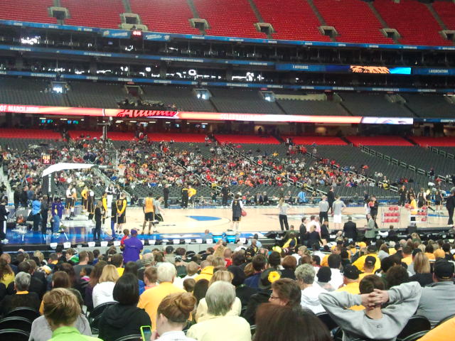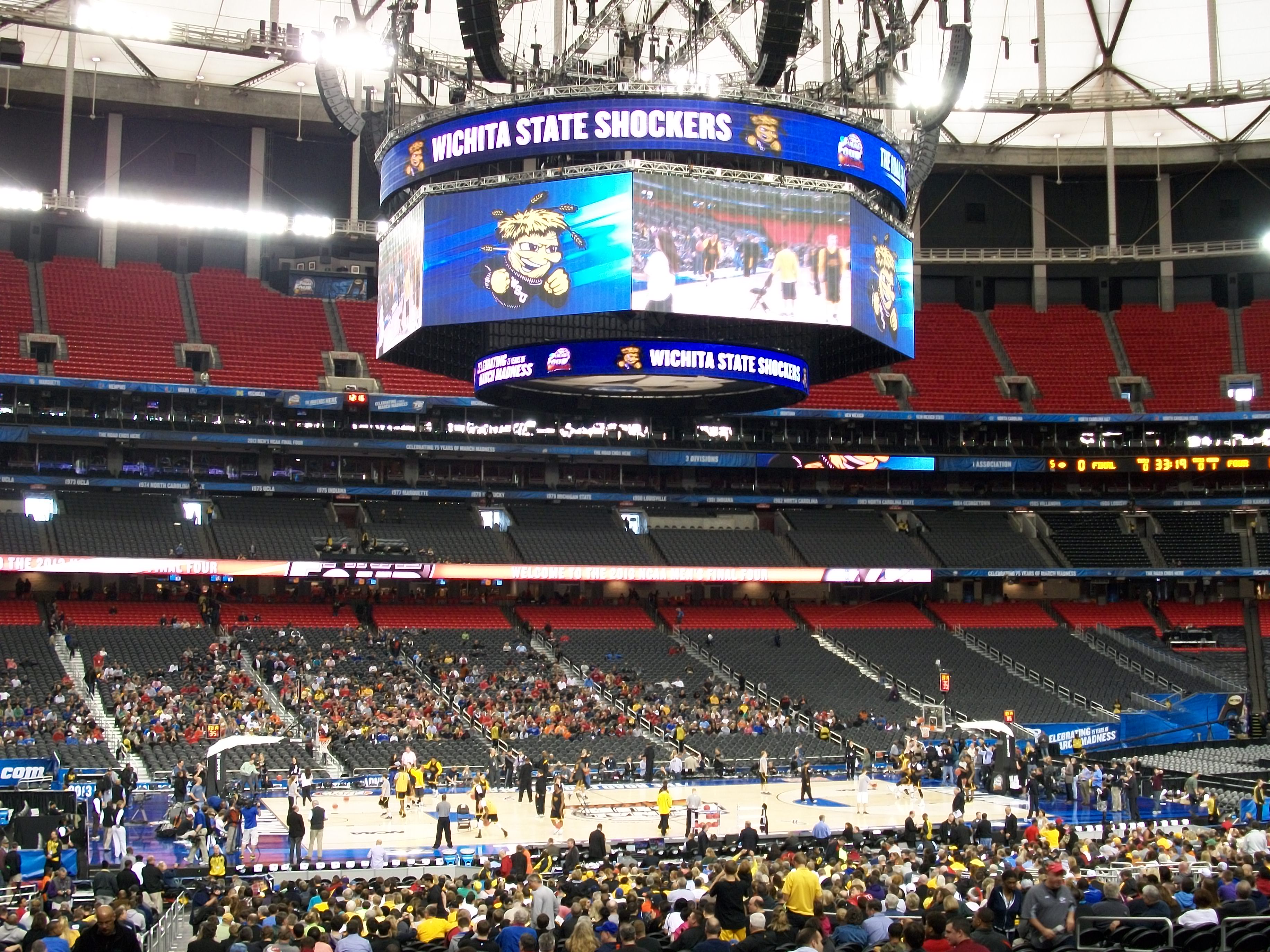 After we got over the initial awe regarding the size of the Georgia Dome (it holds 78,000+ for football games and 56,000+ for basketball), we settled in to watch the open practice of the Shox. Even with WuShock plastered all over the big screens inside the dome, Wichita State on the marquee, and our boys in black and yellow running the floor, it still felt surreal. We were at the Final Four. Wichita State is in the Final Four. At one point, I leaned close to dad and said, “Dad, can you believe we’re here?” He held up his hand for a high-five. Enough said.